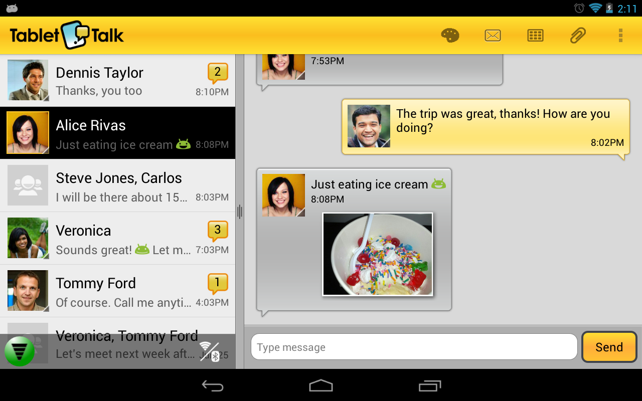 Tablet Talk is a tablet SMS texting app that lets you text from a tablet and even make voice calls, while your phone stays in your pocket! It works with all Android tablets, including Nexus, Galaxy, Note, and Kindle Fire tablets. Unlike other apps, Tablet Talk doesn't force you to use a new phone number... your friends, coworkers, and family can contact you with your existing Android phone number. In addition, Tablet Talk does not require an Internet connection, does not store your data, and does not eat your battery!